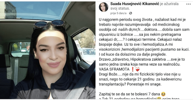 ˝Kažu samoubistvo. Ne mislim tako. Moju Suadu je uzeo sistem u zemlji. Više od 20 godina na dijalizi, molila, preklinjanja, apelovala za pomoć, za priliku da normalno živi. Njeni vapaji nisu imali efekta ondje gdje je trebalo. A onda dodatni šok, čekanja na pretrage. Oprosti ljubice ovoj kukavici od žene koja je jučer držala telefon u ruci nemajući snage da te nazove i opet ponavlja da će sve biti u redu, znajući da ni do sada nije bilo. Ja ću s tim živjeti, a sjećanje na tvoj lik će zauvijek svjedočiti užasnom sistemu, onima koji su imali 21 godinu da ti pruže šansu, nisu to uradili. Samo dragi Bog i ti znate koliko hrabrosti i snage je trebalo svih ovih godina. Teško je reći je li više ljutnja ili tuga prisutna, ali se nadam da će ljudi pamtiti jednu divnu nasmijanu ženu koju nisu zaštitili oni koji su morali. A samo si trebala pruženu priliku. Moramo se boriti da tvoju sudbinu ne doživi više niko nikad˝, napisala je na svom Facebook profilu novinarka BHRT-a Mirela Zonić.