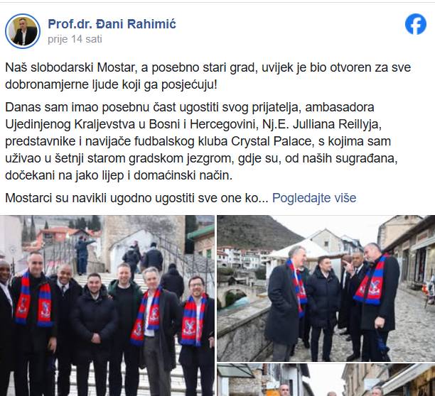 „Gledam kako se predsjednik Gradskoga vijeća Mostara, grada koji je domaćin UEFA Conference League zahvaljujući povijesnom uspjehu HŠK Zrinjski, šeta gradom uz oznake Crystal Palacea. Žalosno je da naš predsjednik Vijeća nosi šal protivničkog kluba i promovira ‘slobodarski Mostar’ u koji su svi dobrodošli, naravno svi osim najuspješnijeg kluba u Bosni i Hercegovini, mostarskog Zrinjskog“, poručio je Kordić.