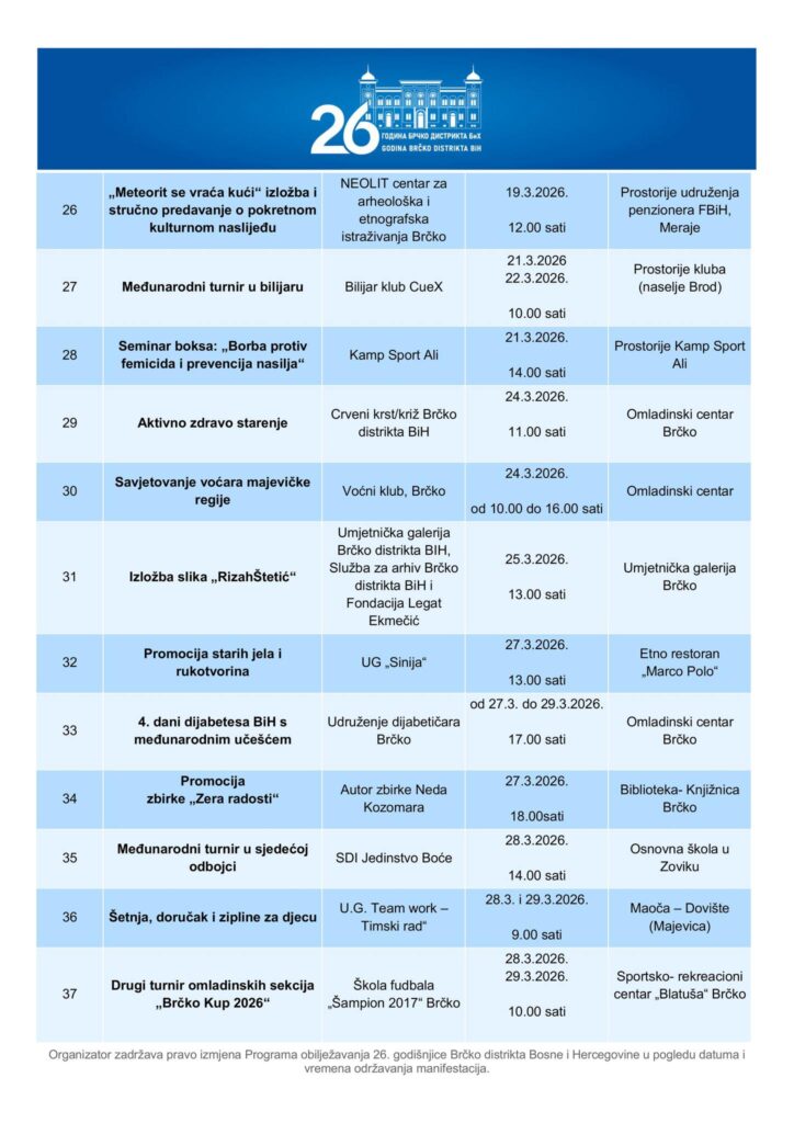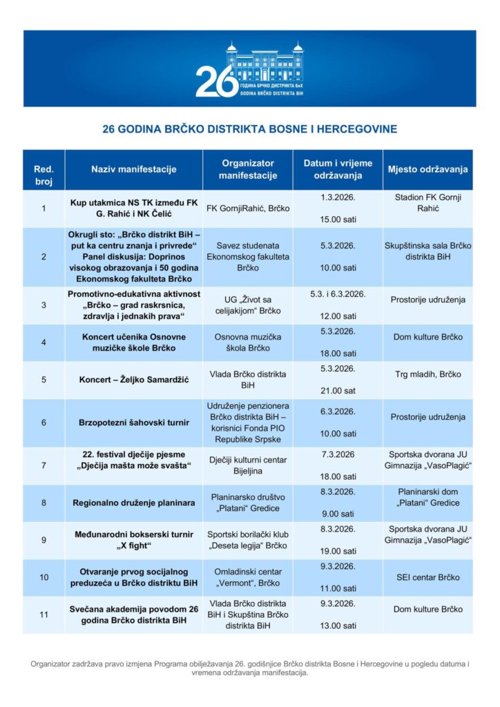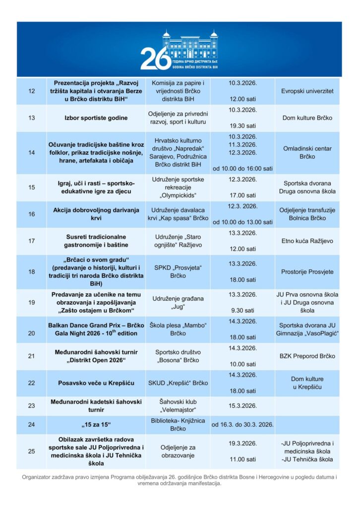 – Među tradicionalnim manifestacijama izdvaja se svečana akademija koja će biti održana 9. marta sa početkom u 13.00, uz prisustvo brojnih zvanica iz javnog života Bosne i Hercegovine. Istog dana bit će upriličena i prezentacija zakonskih rješenja u vezi sa radom berze na području Distrikta, kao i otvaranje prvog socijalnog preduzeća nakon uspostavljanja zakonskog okvira za njihovo osnivanje – pojasnio je Milić.