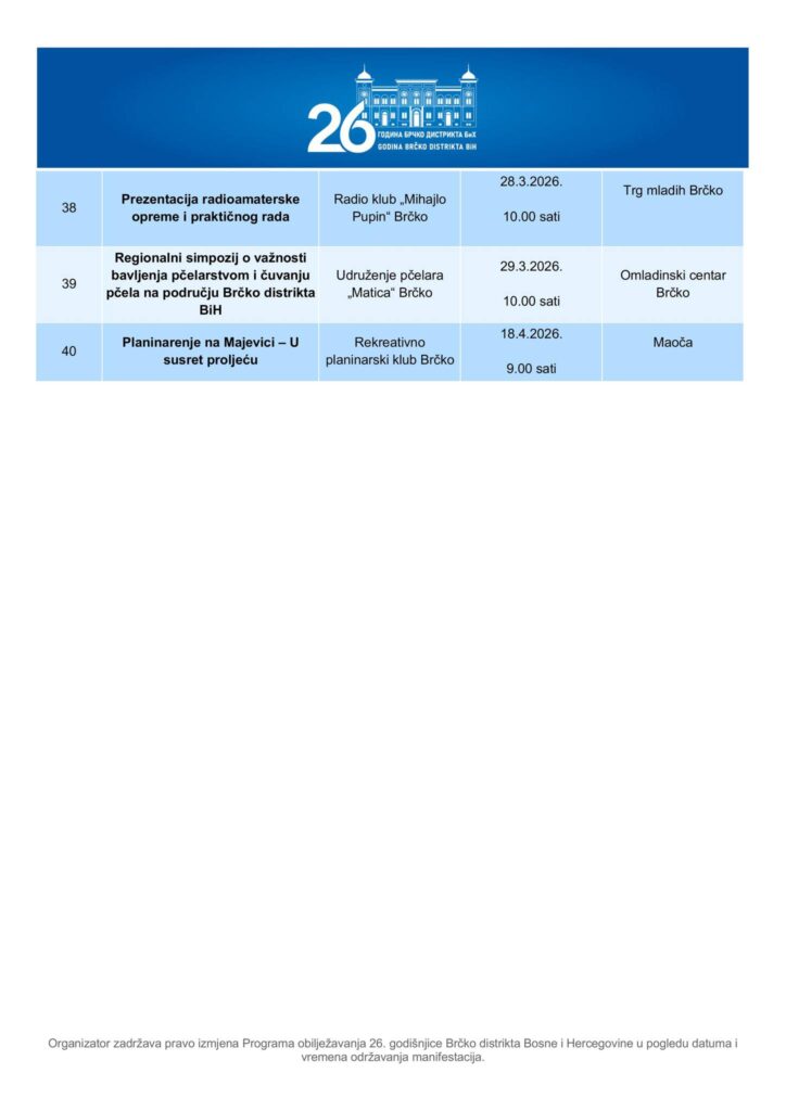 Gradonačelnik Brčko distrikta Bosne i Hercegovine Siniša Milić predstavio je zvaničan program obilježavanja 26. godišnjice Brčko distrikta Bosne i Hercegovine u okviru kojeg će biti realizovano ukupno 40 privrednih, kulturnih, sportskih i muzičkih manifestacija i druženja.