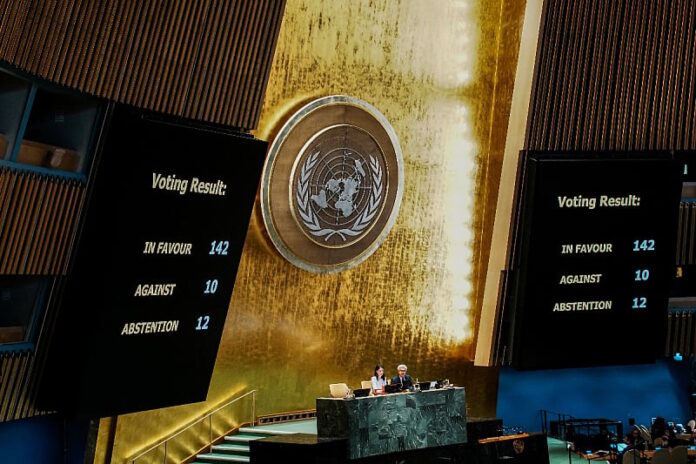 Generalna skupština Ujedinjenih nacija velikom većinom glasova podržala je deklaraciju u kojoj se iznose “vremenski ograničeni i nepovratni koraci” ka rješenju o dvije države između Izraela i Palestinaca, bez učešća Hamasa.