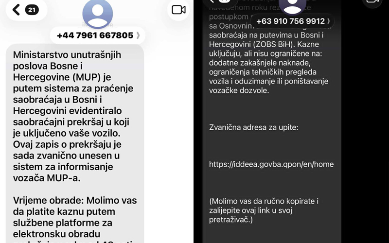 Agencija za identifikacione dokumente, evidenciju i razmjenu podataka (IDDEEA) BiH upozorila je javnost da je u toku organizovana i kontinuirana kampanja slanja lažnih SMS poruka bh. građanima u kojima se neovlašteno koriste nazivi državnih institucija, uključujući IDDEEA BiH i druge organe nadležne za oblast saobraćaja i sigurnosti.