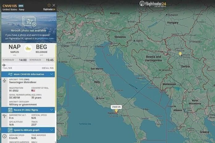 Američki avion “Swearingen Metroliner” u službi američka ratne mornarice polijeće iz Napulja prema Beogradu.