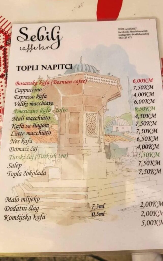 Ponuda se, doduše, nije smanjila – tu su i turski i domaći čaj (5,50 KM i 4 KM), salep, topla čokolada, pa čak i „Komšijska kafa“ za 5 KM – vjerovatno opcija za one kojima je kafa kod komšije ipak postala pristupačnija.