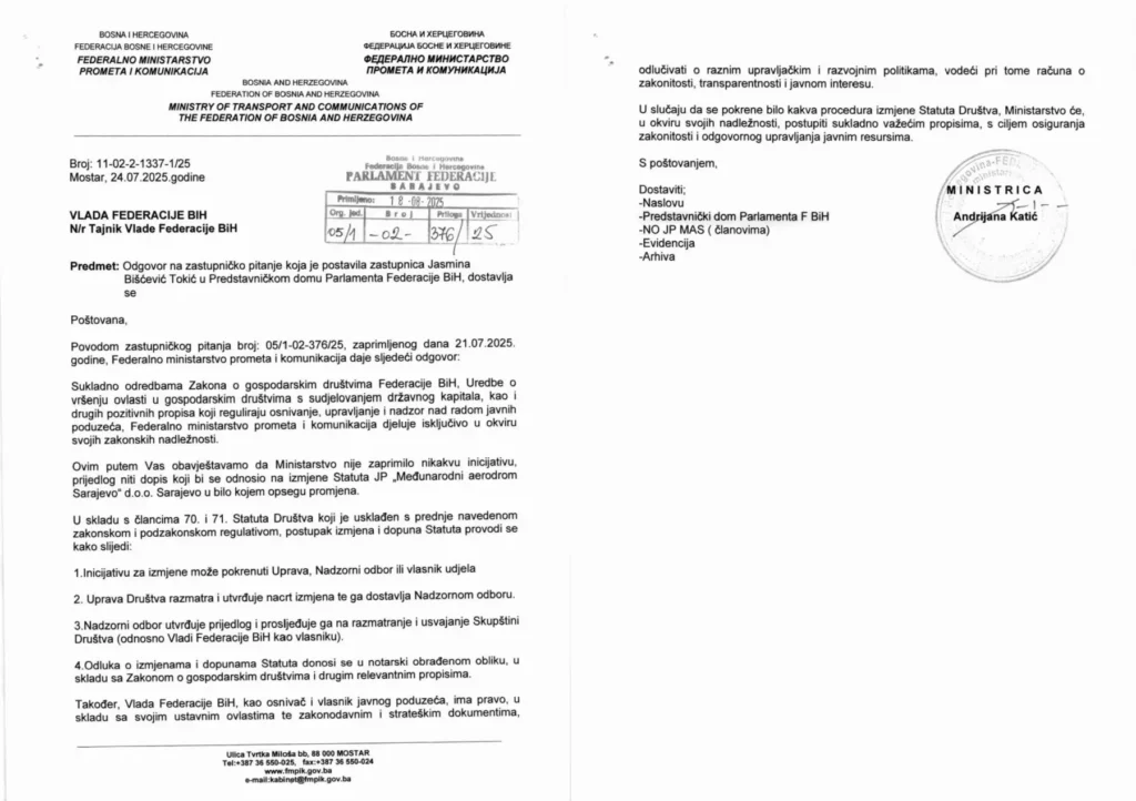 – Ovim putem Vas obavještavamo da Ministarstvo nije zaprimilo nikakvu inicijativu, prijedlog niti dopis koji bi se odnosio na izmjene statuta JP Međunarodni aerodrom Sarajevo.